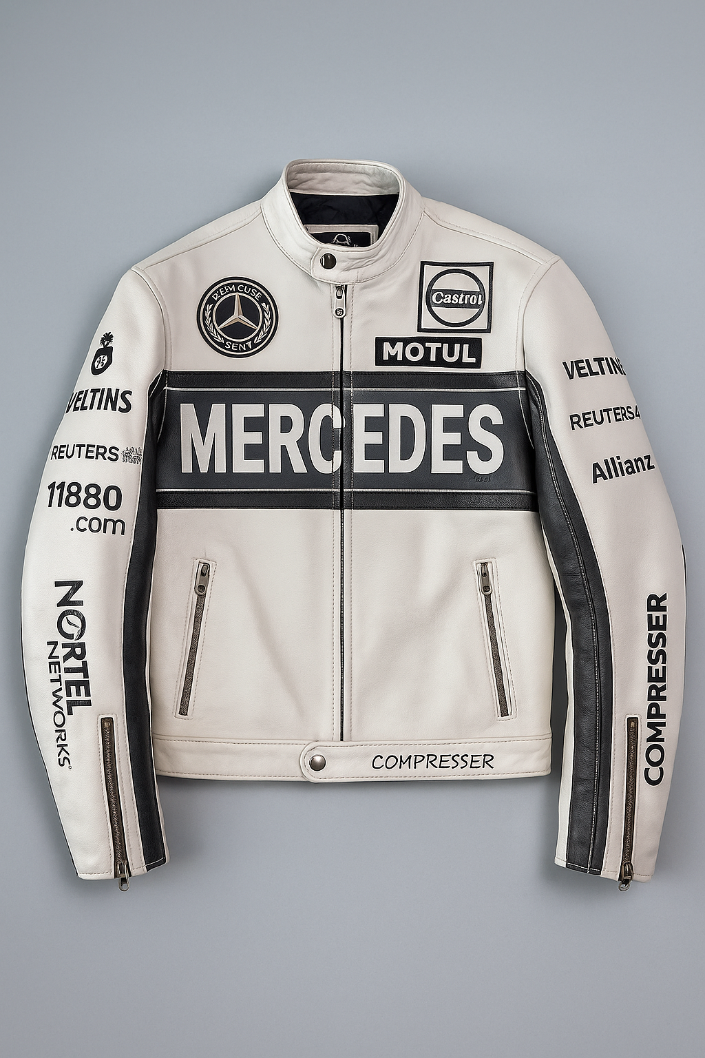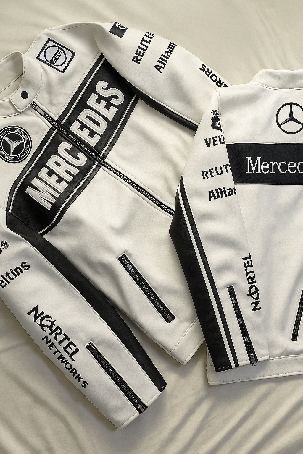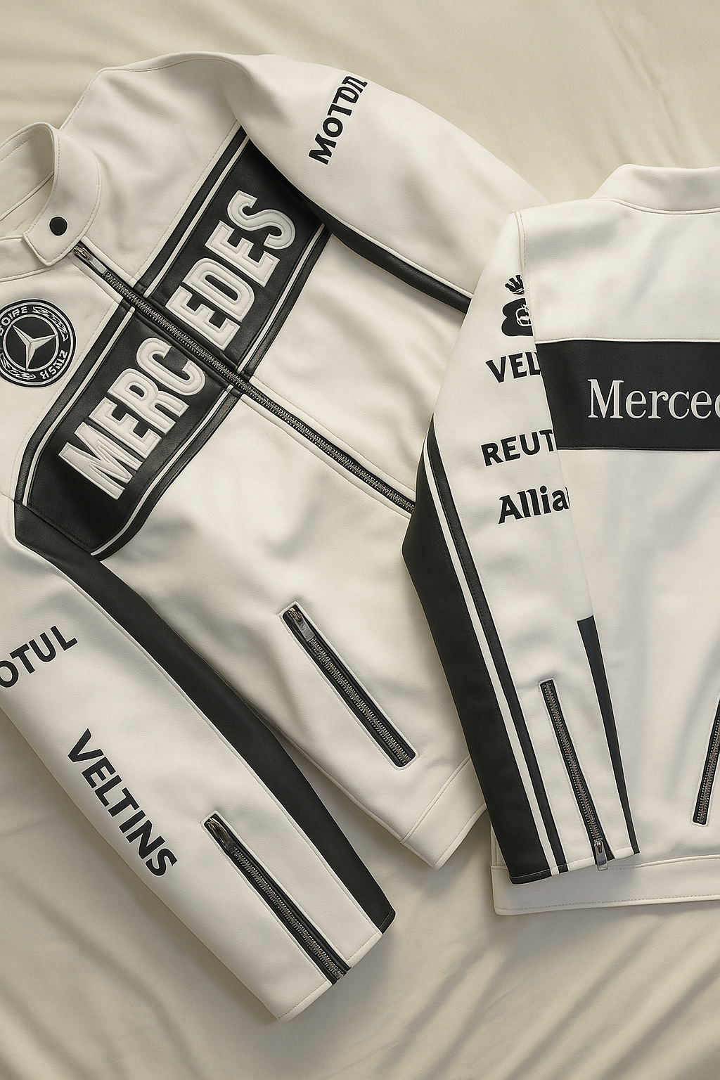 Take your streetwear style to the fast lane with this Mercedes AMG Petronas Varsity Bomber Jacket. Designed for racing fans and fashion-forward individuals, this jacket blends premium quality with bold motorsport branding for the ultimate statement look.