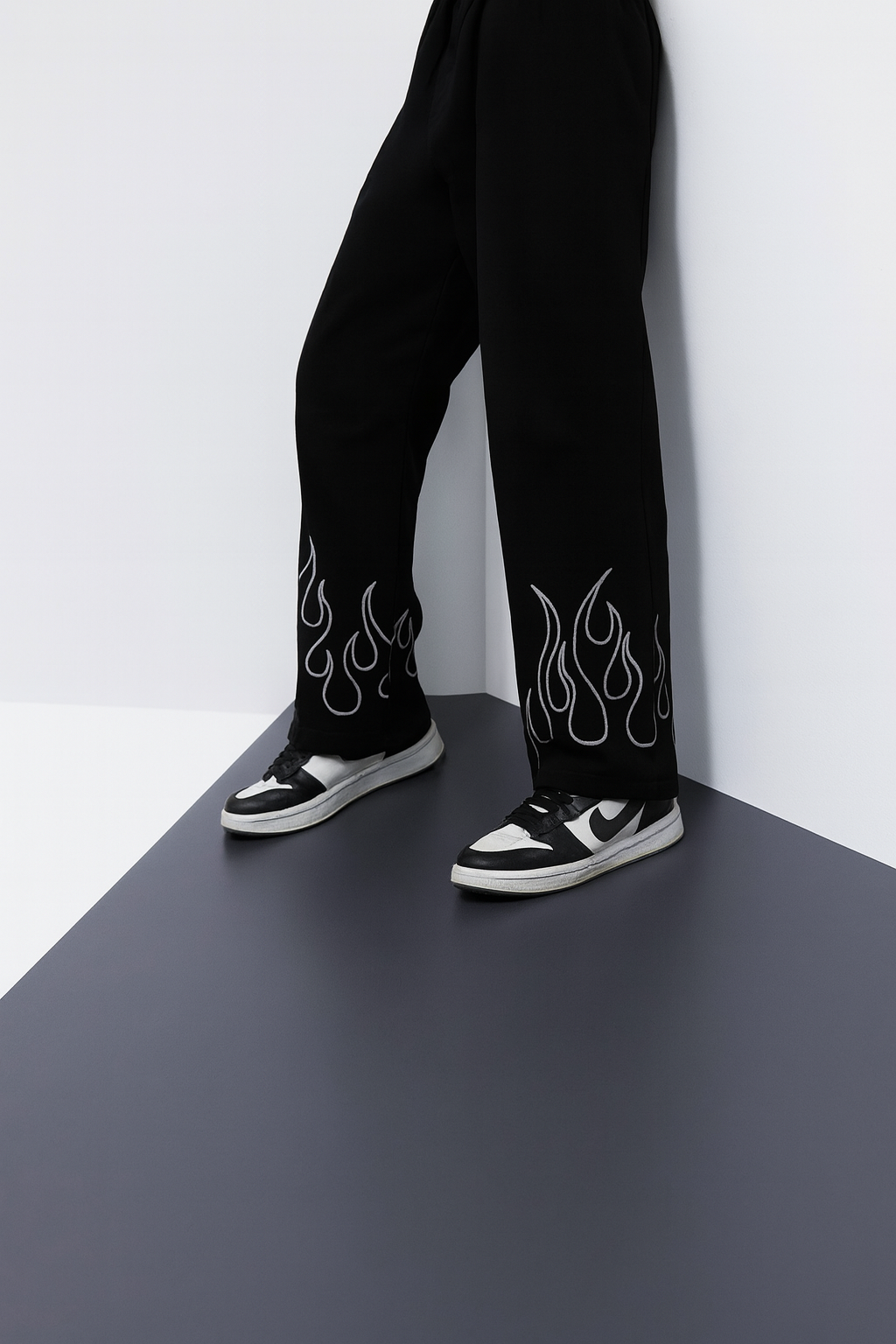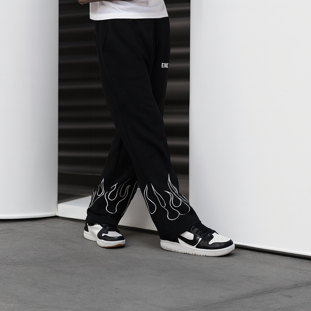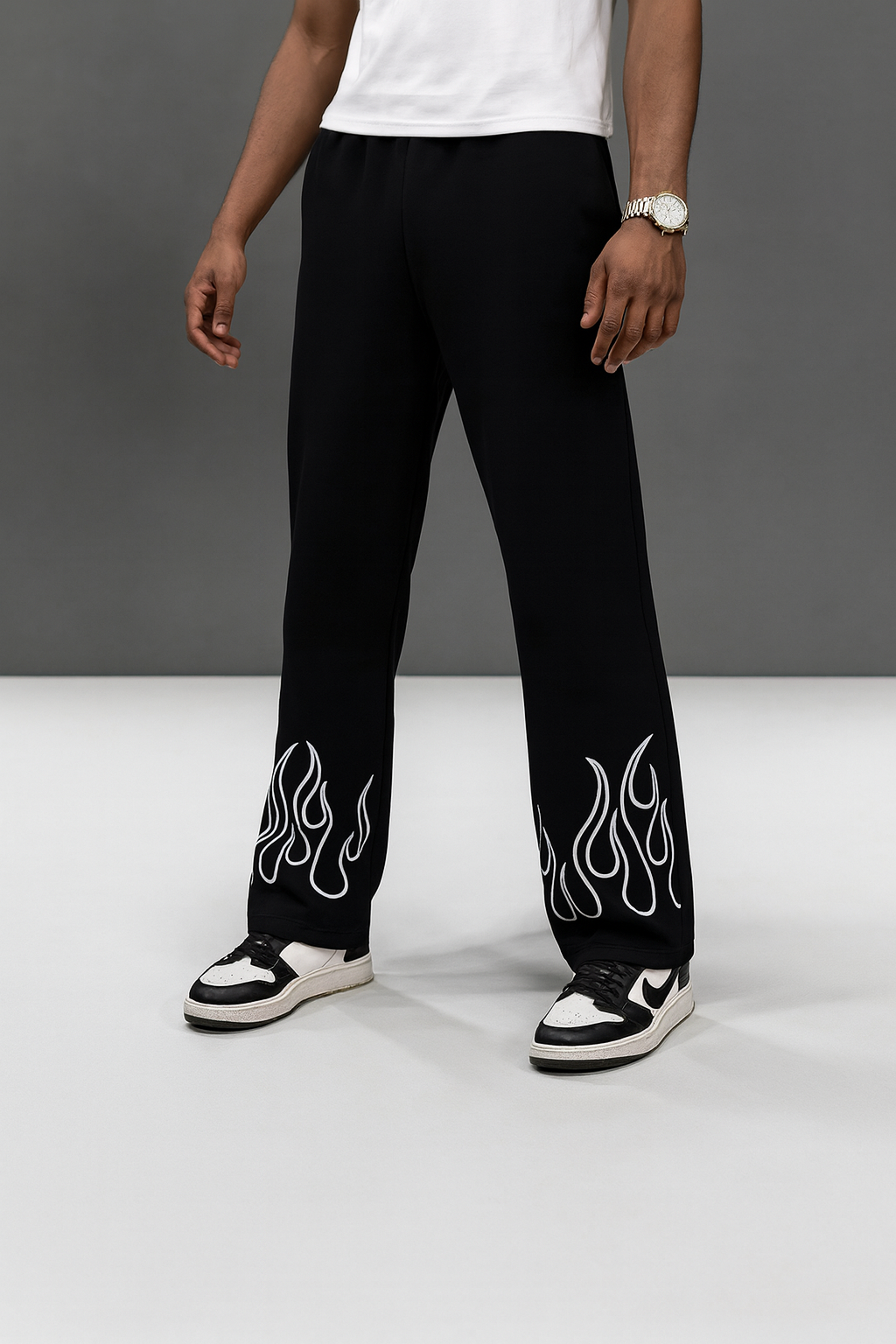 URBXN Black Flame Print Trousers – Streetwear Wide Leg Pants